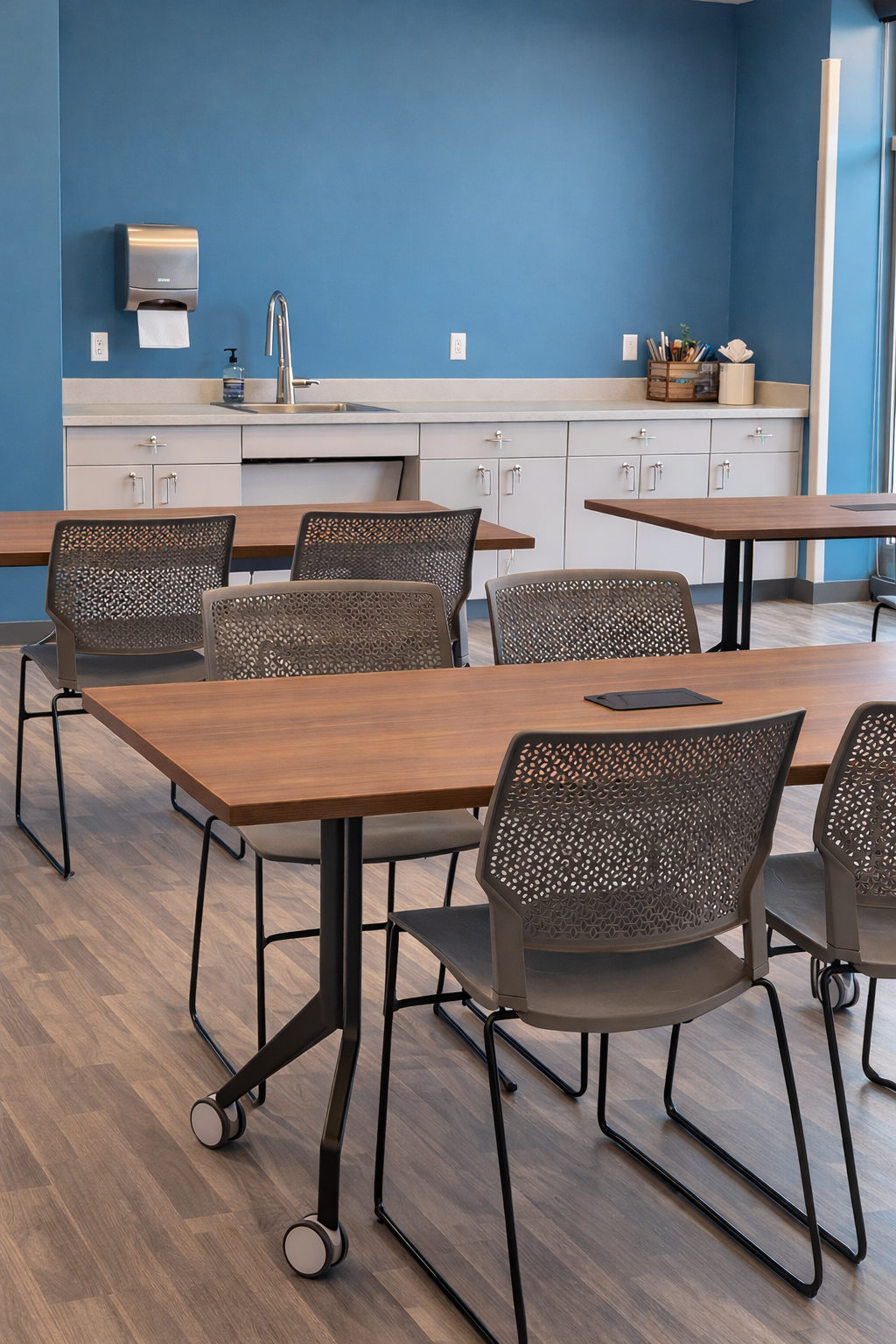 Our furniture planning and design approach focused on creating adaptable, high-performance environments that support both individual and group activities. Private offices were equipped with efficient workstations, integrated storage, and ergonomic seating to enhance day-to-day operations. Multi-purpose rooms were designed for maximum flexibility, utilizing flip/nest tables and stackable seating to quickly transition between meetings, training sessions, and community events.